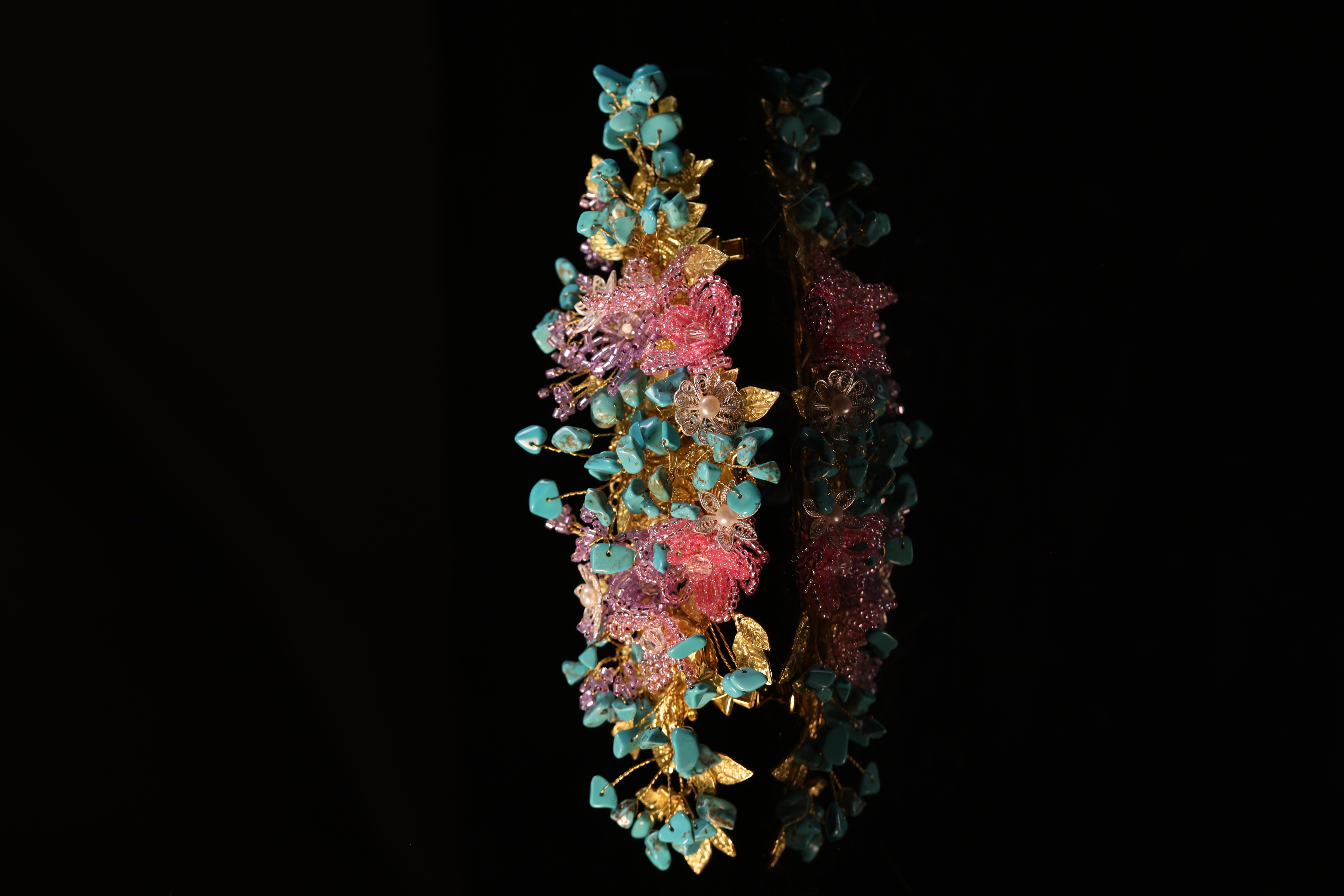 或许是她隐约能看到,头饰上嵌有白色的、类似螺钿一类的装饰。雁鸿发挥所长,通过成都银花丝技艺制作的平填技法,一朵一朵地拼贴出来后,通过焊接、酸洗、打磨抛光还原出银丝的本色,最终再将珍珠镶嵌在银丝上。在此基础上,雁鸿还用搓丝工艺制作了金色的枝桠,再配上金色的叶片,让整个头饰更显精致和层次感。